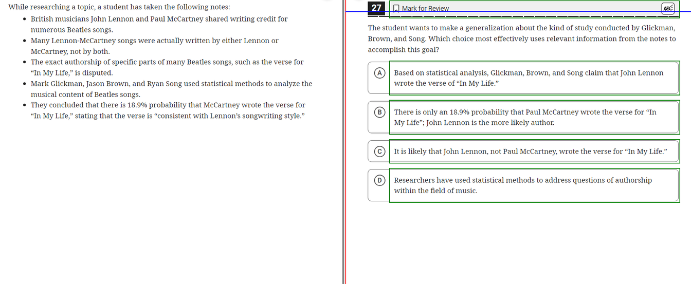 With data from the SAT question bank, I couldn't determine an objectively correct answer to this question. Let's look at the new tests instead.