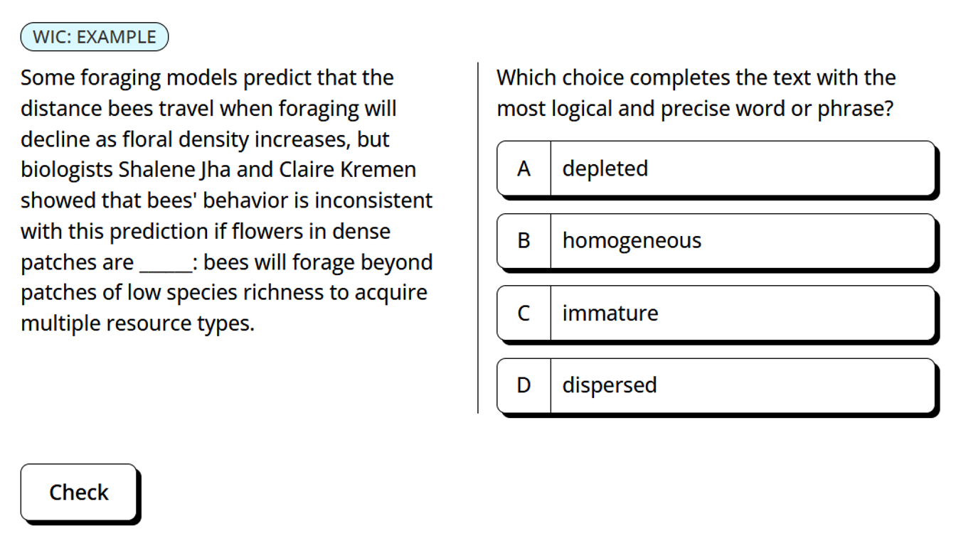 In the SAT, Words in context questions asks students to pick the most fitting word or phrase to fill in the blank or replace a word in the passage.